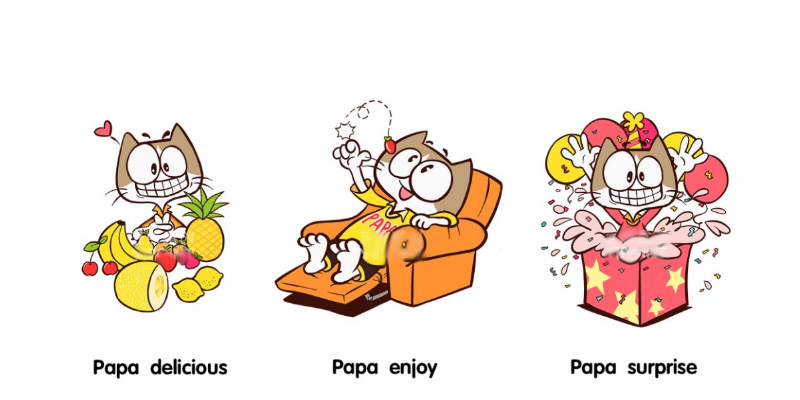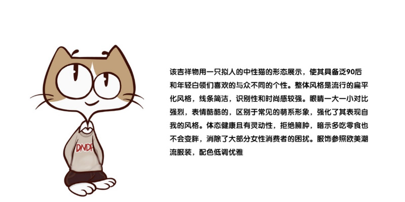 該吉祥物用一只擬人的中性貓的形態展示,使其具備泛90后 和年輕白領們喜歡的與眾不同的個性。整體風格是流行的扁平 化風格,線條簡潔,識別性和時尚感較強。眼睛一大一小對比 強烈,表情酷酷的,區別于常見的萌系形象,強化了其表現自 我的風格。體態健康且有靈動性,拒絕臃腫,暗示多吃零食也 不會變胖,消除了大部分女性消費者的困擾。服飾參照歐美潮 流服裝,配色低調優雅.